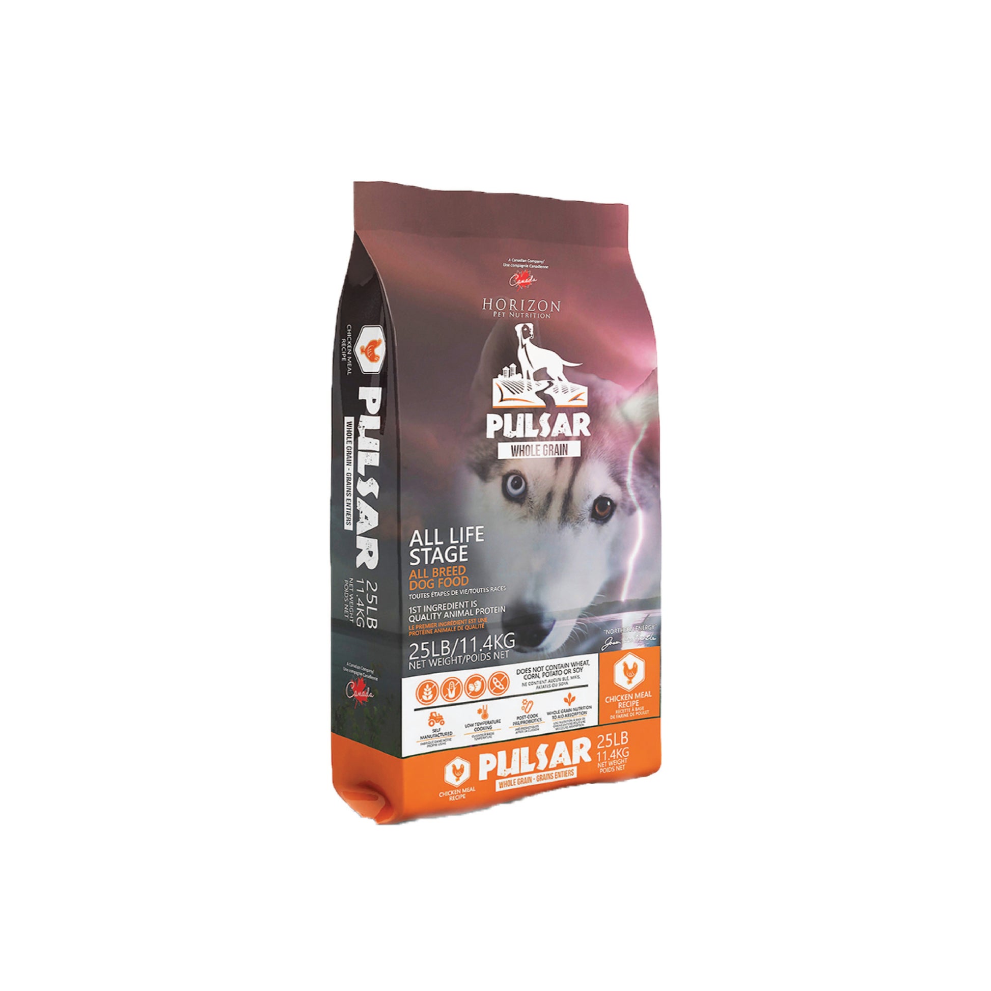 LA FORMULE PULSAR POULET GRAINS ENTIERS POUR CHIENS DE HORIZON EST FORMULÉE POUR RENCONTRER LES EXIGENCES NUTRITIONNELLES ÉTABLIES PAR L’AAFCO SELON LES PROFILS NUTRITIONNELS REQUIS POUR LES CHIENS DE TOUTES LES ÉTAPES DE VIE INCLUANT LES CHIOTS DE GRANDE RACE EN CROISSANCE (70 LBS ET PLUS À L’ÂGE ADULTE)