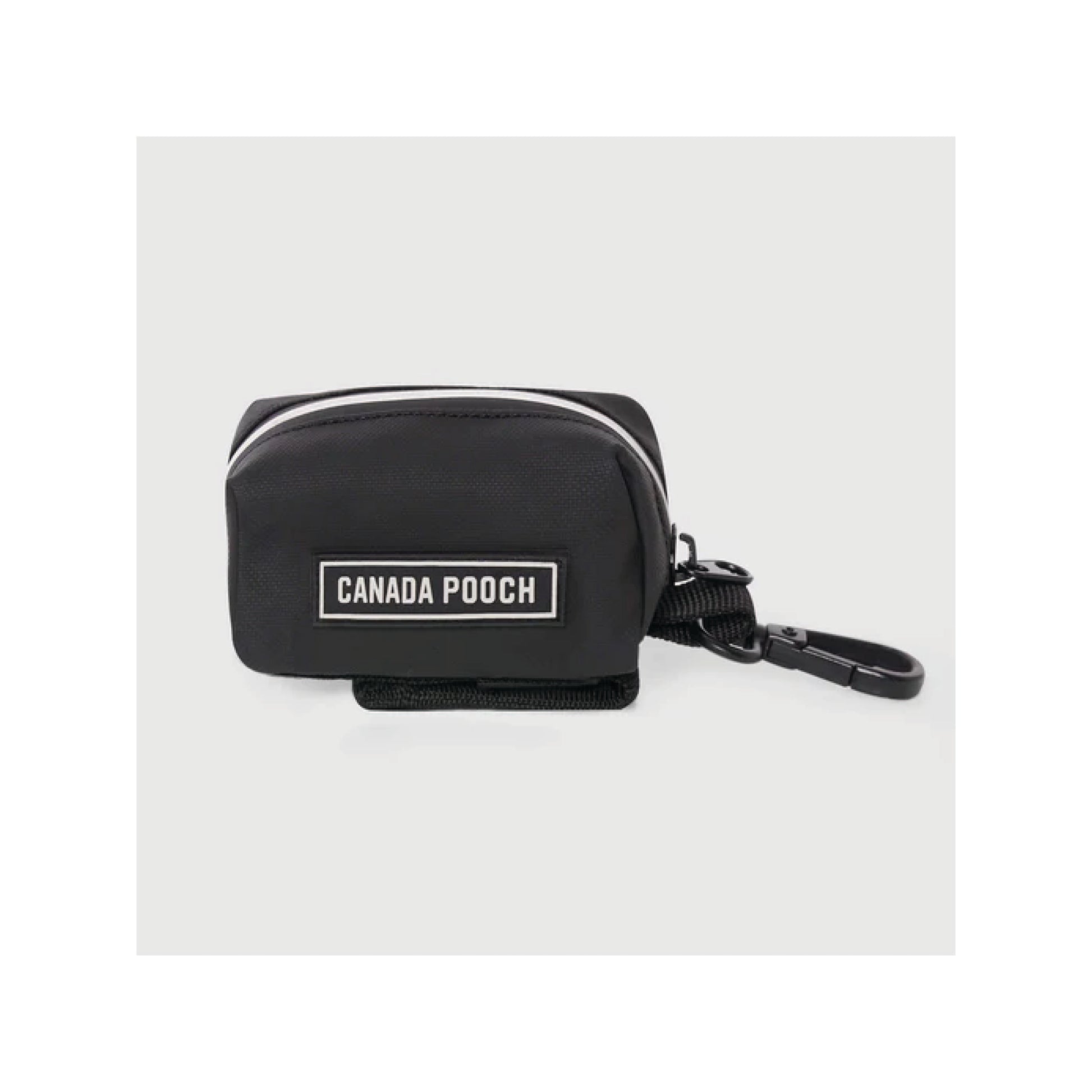 This poop bag dispenser features a waterproof zipper and water-resistant material and has reflective trim for enhanced night visibility. It can clip onto the D-ring of the leash or on the harness.