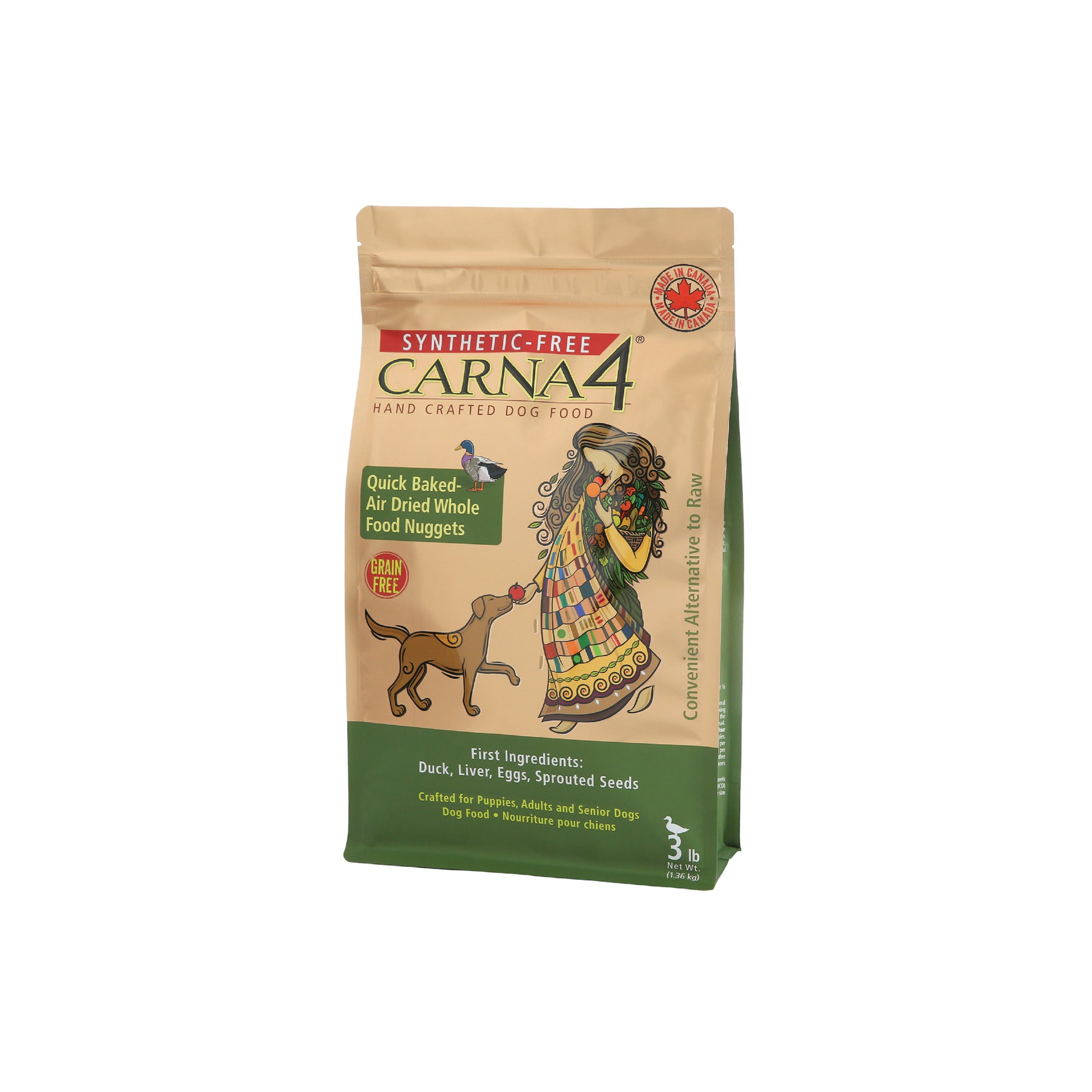 Carna4 Grain-free Duck is whole food nutrition for all life stages of your dog. This Canadian-made pet food starts with fresh duck (Carna4 uses the muscle and flesh, no by-products) from humanely-raised ducks on Quebec and Ontario farms. No meat or vegetable meals, ever. It then adds pork liver, whole eggs, clean, de-boned herring, whole produce, its certified organic its certified organicĀ sprouted seedsĀ and nutrient-rich kelp. It then quick-bakes & gently dries it to give your dog highly digestible vitamins and minerals,Ā without synthetic additives of any kind. No vitaminĀ pre-mixĀ needed, ever.