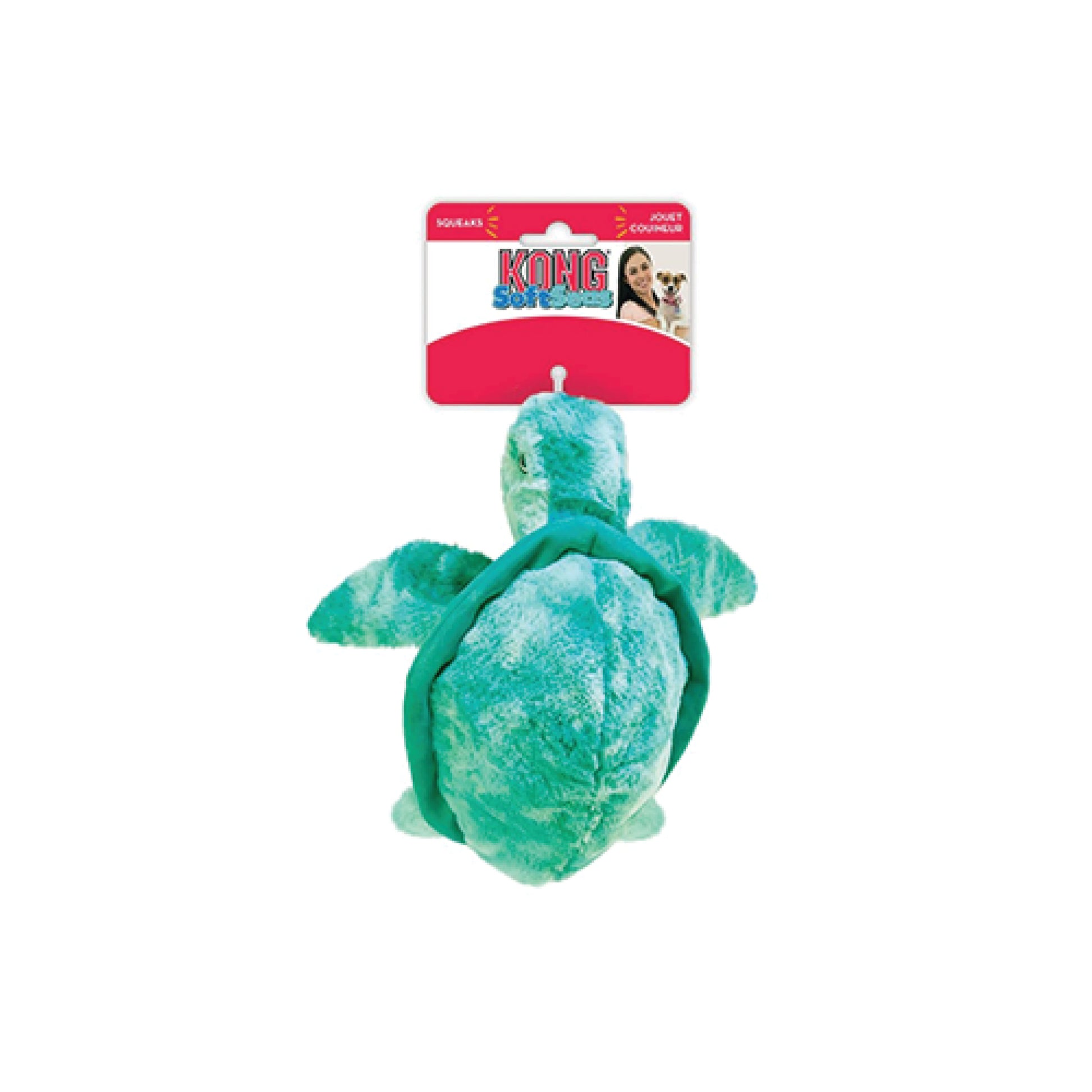 Kong® SoftSeas Turtle's thick plush makes it irresistible for grabbing while its thick body makes it ideal for cuddling or gentle indoor play; it squeaks and crinkles, keeping pups submerged in long-lasting, healthy playtime fun.