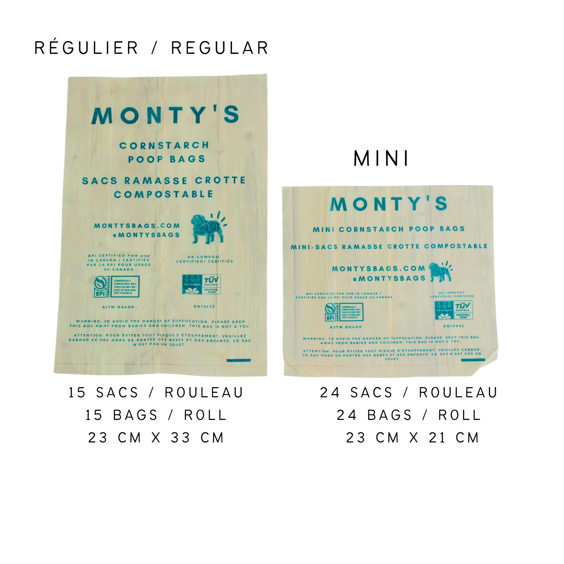 Introducing Monty's brand new mini sized eco-friendly, biodegradable and compostable dog poop bags! These mini cornstarch poop bags have been designed to offer a more sustainable and eco-friendly alternative to conventional plastic pet waste bags.