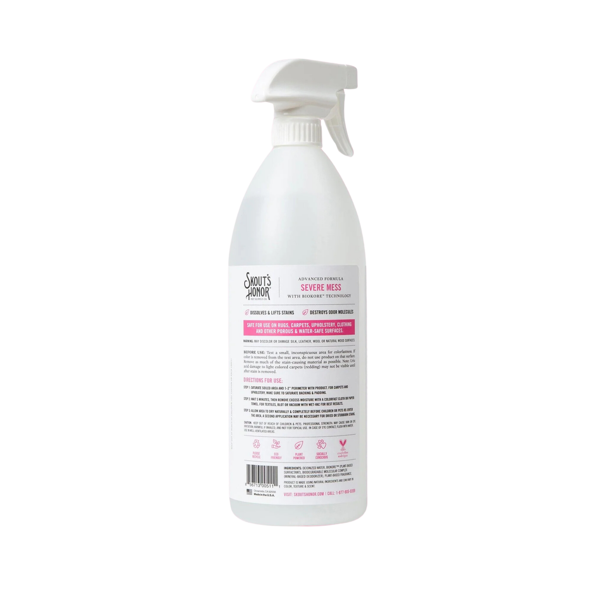 Ingredients: Deionized Water, Biokore™ (Plant-Based Surfactant), Biodegradable Molecular Complex (Mineral-Based Deodorizer), Plant-Based Fragrance