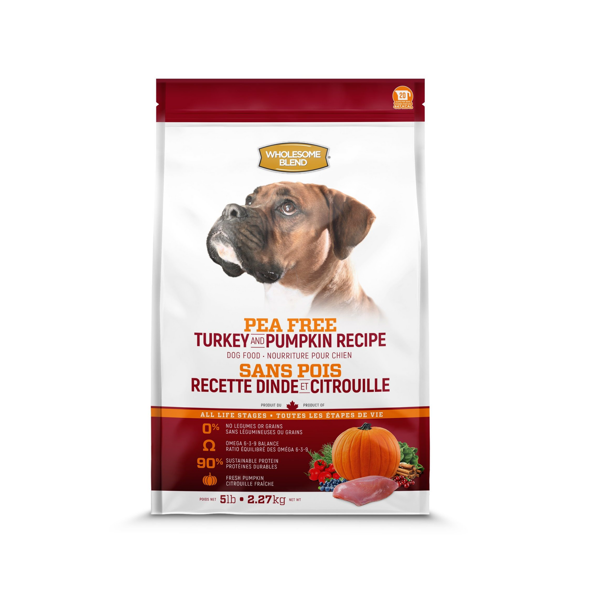 Wholesome Blend Pea-Free Turkey and Pumpkin Recipe Dog Food is formulated to meet the nutritional levels established by the AAFCO Dog Food Nutrient Profiles for all life stages including growth of large size dogs (70 lb. or more as an adult).